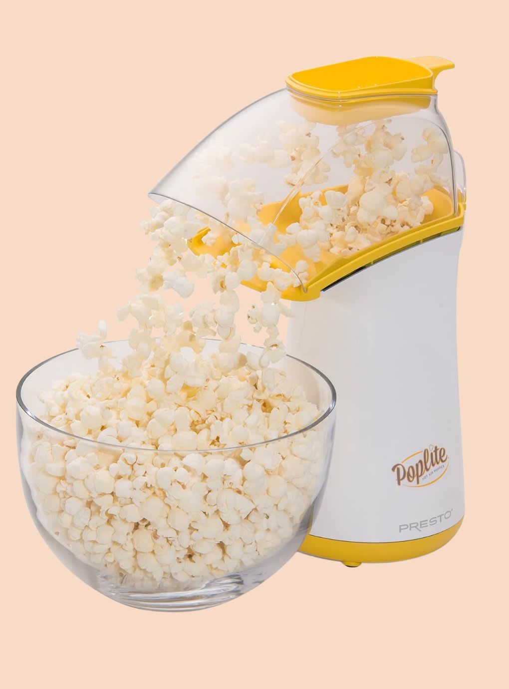 Plug in Presto’s PopLite and the party begins. In less than 2-1/2 minutes you’ll have up to 18 cups–two large bowlfuls–of fluffy popcorn with virtually no unpopped kernels. And because the machine uses hot air instead of oil, the resulting snack is healthier and lower in calories. That’s not to say you can’t add butter; in fact, the 1/2-cup measuring cup on top of the popper doubles as a butter melter. Simply put in the desired amount of margarine or butter (room temperature is best), and it melts from the heat produced during the popping process. The clear plastic cover and cup, which must stay on during popping so the popped corn doesn’t fly all over the room, easily remove for hand cleaning with warm, soapy water. No other clean-up is required. While a few unpopped kernels spring out the chute as the machine begins to heats up, the chute does a good job of directing the popped corn into a bowl.